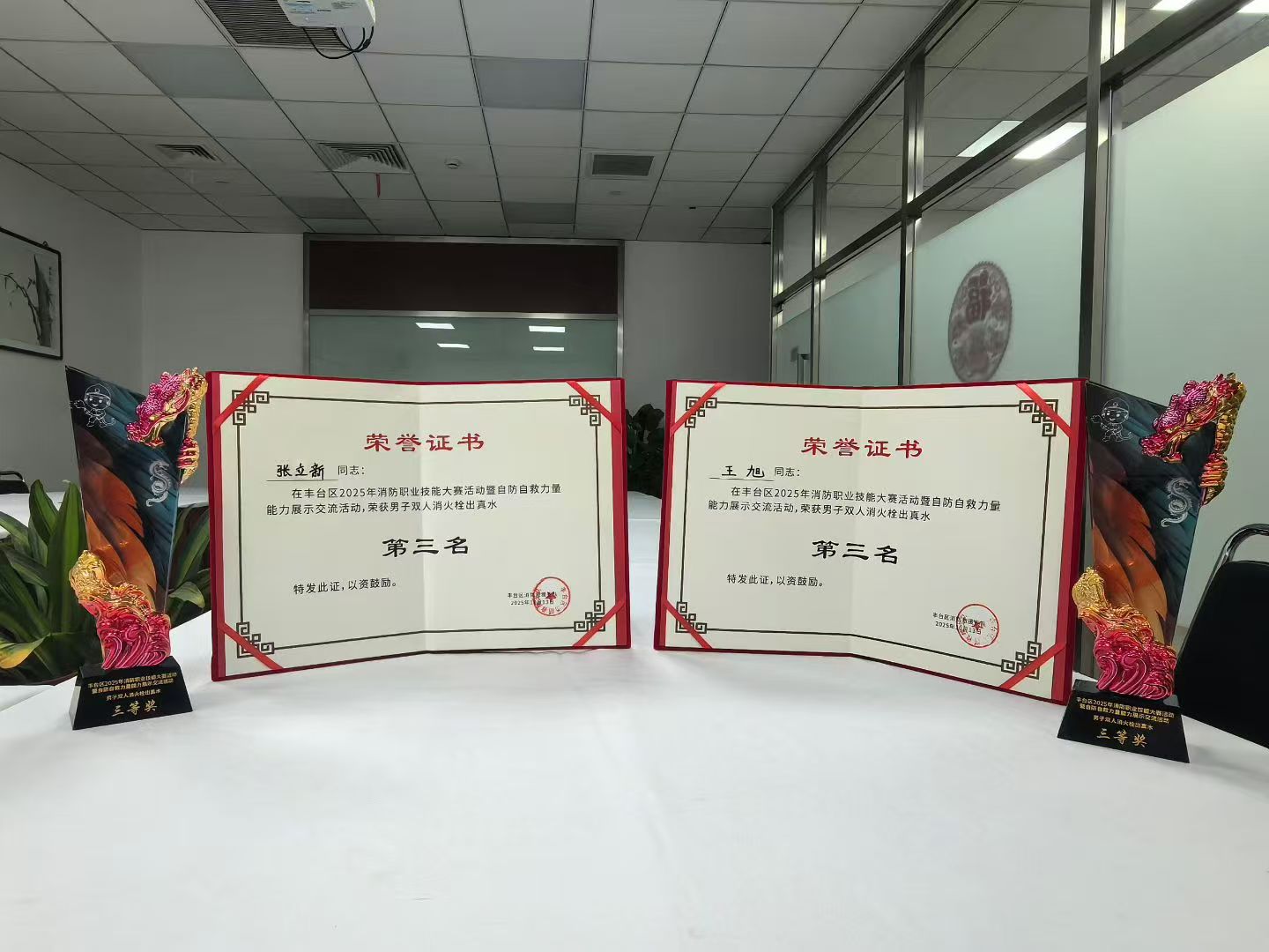 公司國投項(xiàng)目員工張立新、王旭兩位同志,代表太平橋街道出戰(zhàn)本次大賽。在比賽中,他們沉著應(yīng)對(duì)、頑強(qiáng)拼搏,展現(xiàn)出扎實(shí)的消防技能與出色的團(tuán)隊(duì)協(xié)作能力,最終在雙人賽男子組消火栓出真水項(xiàng)目中脫穎而出,榮獲全區(qū)第三名的優(yōu)異成績。